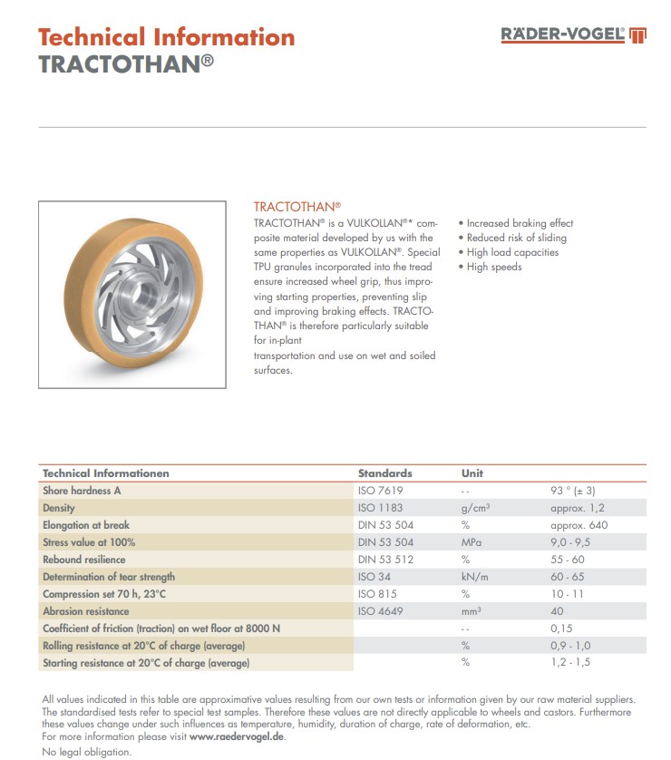 Además, TRACTOTHAN® ofrece un equilibrio óptimo entre dureza, elasticidad y resistencia a la abrasión, lo que lo convierte en un material ideal para un uso intensivo y prolongado en ruedas industriales.